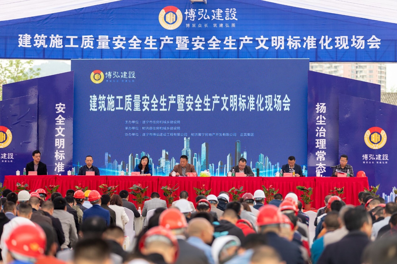 4月11日,由遂寧市住房和城鄉(xiāng)建設局主辦,射洪縣住房和城鄉(xiāng)建設局協(xié)辦的“2019年全市建筑施工質量安全生產暨安全生產文明施工標準化觀摩會”,由射洪馨寧公司開發(fā)、遂寧市博弘建設工程有限公司(以下簡稱博弘建司)承建的“正黃·金域香江”項目施工現(xiàn)場順利召開。遂寧市住建局黨委書記敬茂軍、射洪縣副縣長鄒清、射洪縣住建局局長王彬、遂寧市質量安全監(jiān)督站站長周杰等相關領導親臨現(xiàn)場并做重要講話,全市二級以上施工單位共700多名同行參加了此次觀摩會。